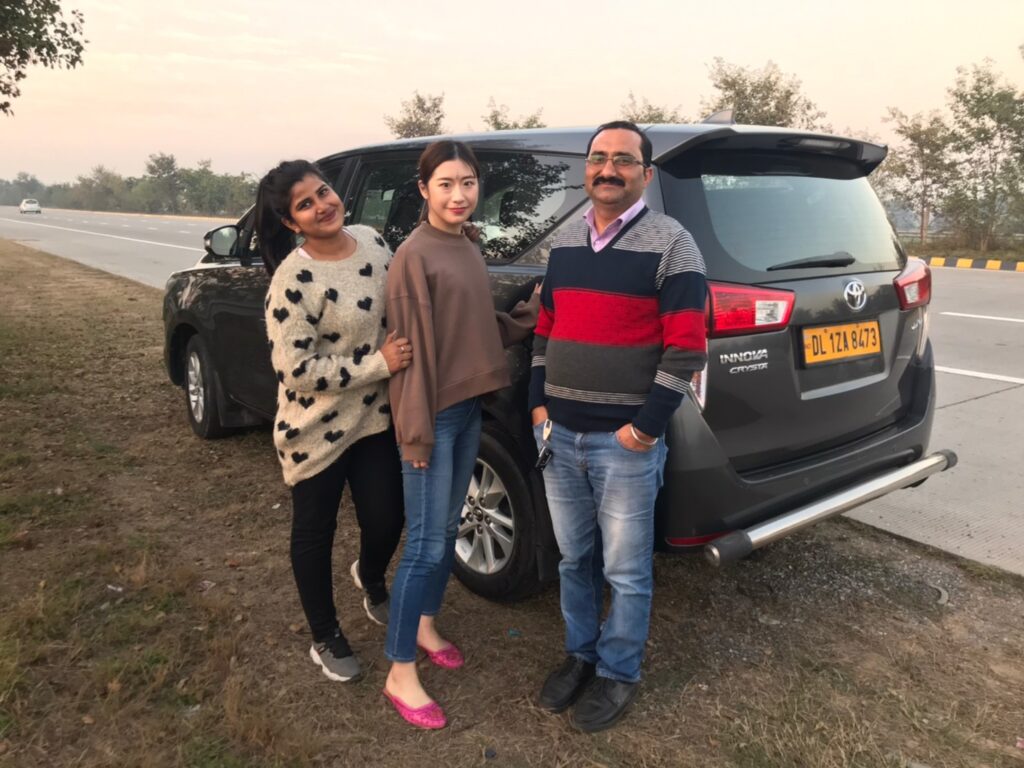 以下の写真は専用車のイメージです。左側のインド女性は当社の日本語ガイド、右側男性はドライバーです。