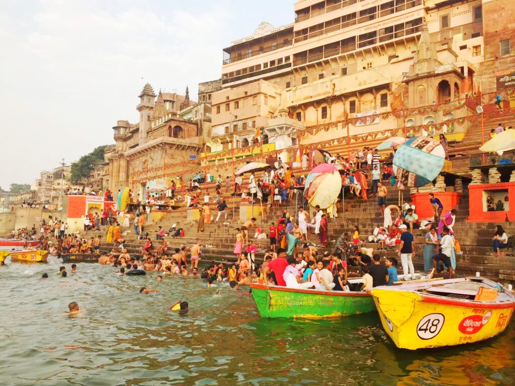 朝のガンジス川をボートに乗って観光、ガンジス川のガートを散策