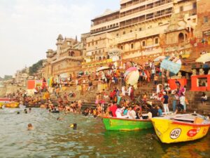 朝のガンジス川をボートに乗って観光、バラナシ市内観光。